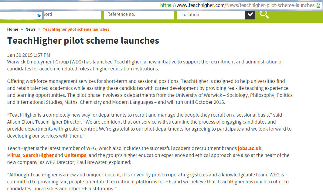 warwick-universityWhile revolts against the neoliberalization and commercialization of higher education have been sweeping Dutch universities and London universities, the University of Warwick (whose motto is “Mind moves matter”) is giving in to the dangerous logic of “profit above all”. The university management will be changing the way it employs hourly paid academic staff by using a subsidiary company. This ‘flexible workforce’ scheme is being piloted in the departments of Philosophy, Sociology, Politics and International Studies, Modern Foreign Languages, Chemistry and Mathematics. Protocols of University committees reveal that TeachHigher, which has been set up by Warwick University-owned ‘Warwick Employment Group’ wich is a part of Campus and Commercial Services Group, will in the future become the “sole method of recruiting temporary academic staff”. TeachHigher claims that it wants to make the employment of casualised academic staff more “standardised and efficient“. “TeachHigher is a completely new way for departments to recruit and manage the people they recruit on a sessional basis,” said Alison Elton, TeachHigher Director.