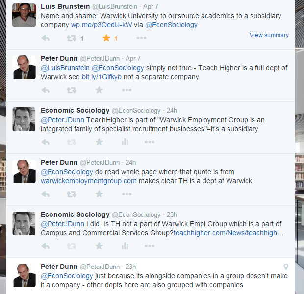 If you do want more, take a look at this sort of conversation I had with Warwick spokesman, in which he preferred to quibble about corporate governance definitions, instead of expressing concern for the quality of research and teaching due to gross violation of essential contract, based on the Enlightenment truths, between the university and its scholars. But at the end, he – as a representative of neoliberal aspirations for more so-called “efficiency” instead of liberal values for more education and the social good – failed.