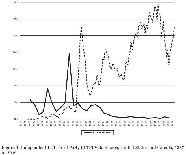 In a very interesting paper (open access) recently published in American Sociological Review, Eidlin scrutinizes these profound questions that has had deep implications for the U.S. politics, social policy and political economy, using Canada as a comparative case. The paper claims that underlying social structures, political culture and institutions did not affect labor party support as expected: support was similar in both countries prior to the 1930s (prior to World War I, the support was even higher in the United States than in Canada), then diverged. Why?