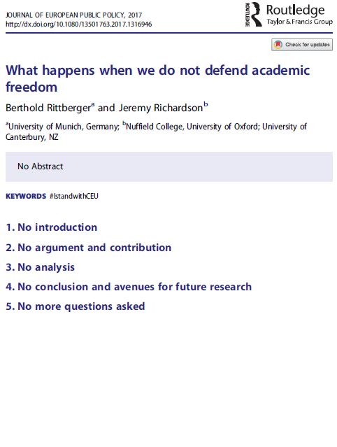 Rittberger, Berthold and Jeremy Richardson. 2017. “What happens when we do not defend academic freedom.” Journal of European Public Policy (Published online: 18 April) DOI: 10.1080/13501763.2017.1316946