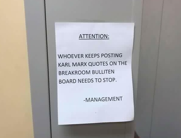 Whoever keeps posting Karl Marx quotes on the breakroom bulliten board needs to stop.